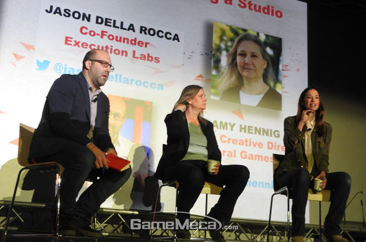▲ '어쌔신 크리드' 내러티브에 대해 이야기 중인 제이드 레이몬드 (우) (사진출처: venturebeat)