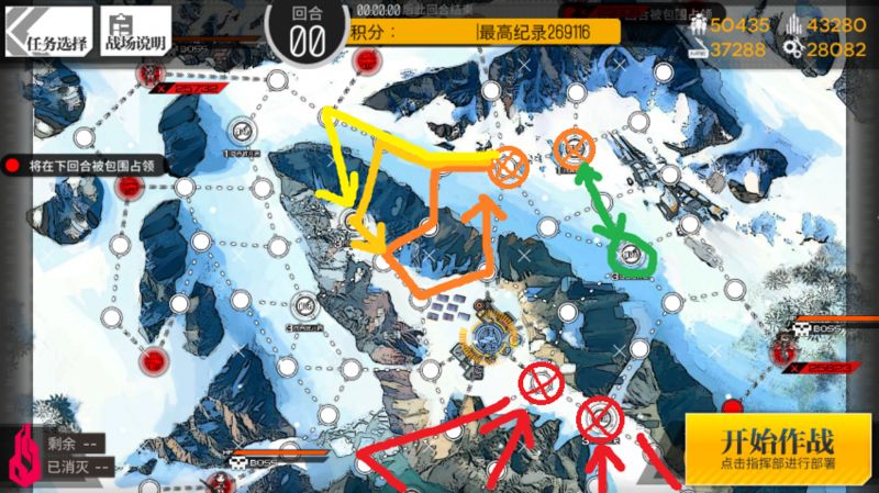 오른쪽 위 주황색 원 두개는 매턴 빡세게 굴릴 소대 (+1턴 헬리포트)